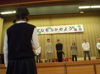 | 児童会長からすくすくにお礼の言葉を頂きました。 | ふっくんから、児童のみんなにご挨拶☆ |